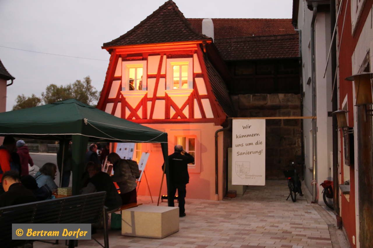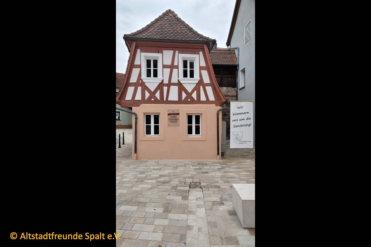 Es weiter verfallen zu lassen, das war für die Altstadtfreunde Spalt keine Option. Deshalb beschloss der Verein, sich um die Sanierung dieses städtischen Gebäudes zu kümmern. In enger und äußerst konstruktiver Zusammenarbeit mit der unteren Denkmalschutzbehörde in Person von Martin Danninger wurde die Sanierung geplant. Anträge wurden geschrieben, mit Handwerkern die notwendigen Sanierungsschritte besprochen. Und es war viel zu tun. Die Außenfassade, einschließlich des Fachwerks, musste ausgebessert und gestrichen werden. Die Gefache wurden teilweise erneuert, die Fenster ausgebessert und gestrichen, die Scheiben neu eingekittet. Der überbaute Rest der Stadtmauer auf der Rückseite wurde vor Jahren völlig unsachgemäß überstrichen und verfugt. Also galt es, die Sandsteine zu reinigen und fachgerecht neu zu verfugen.