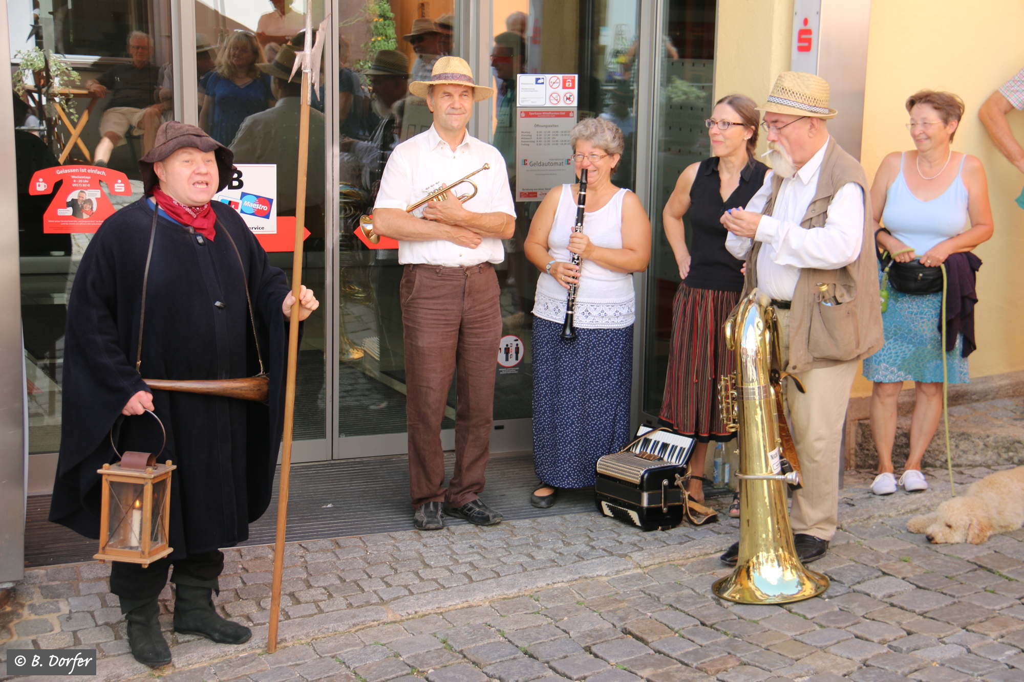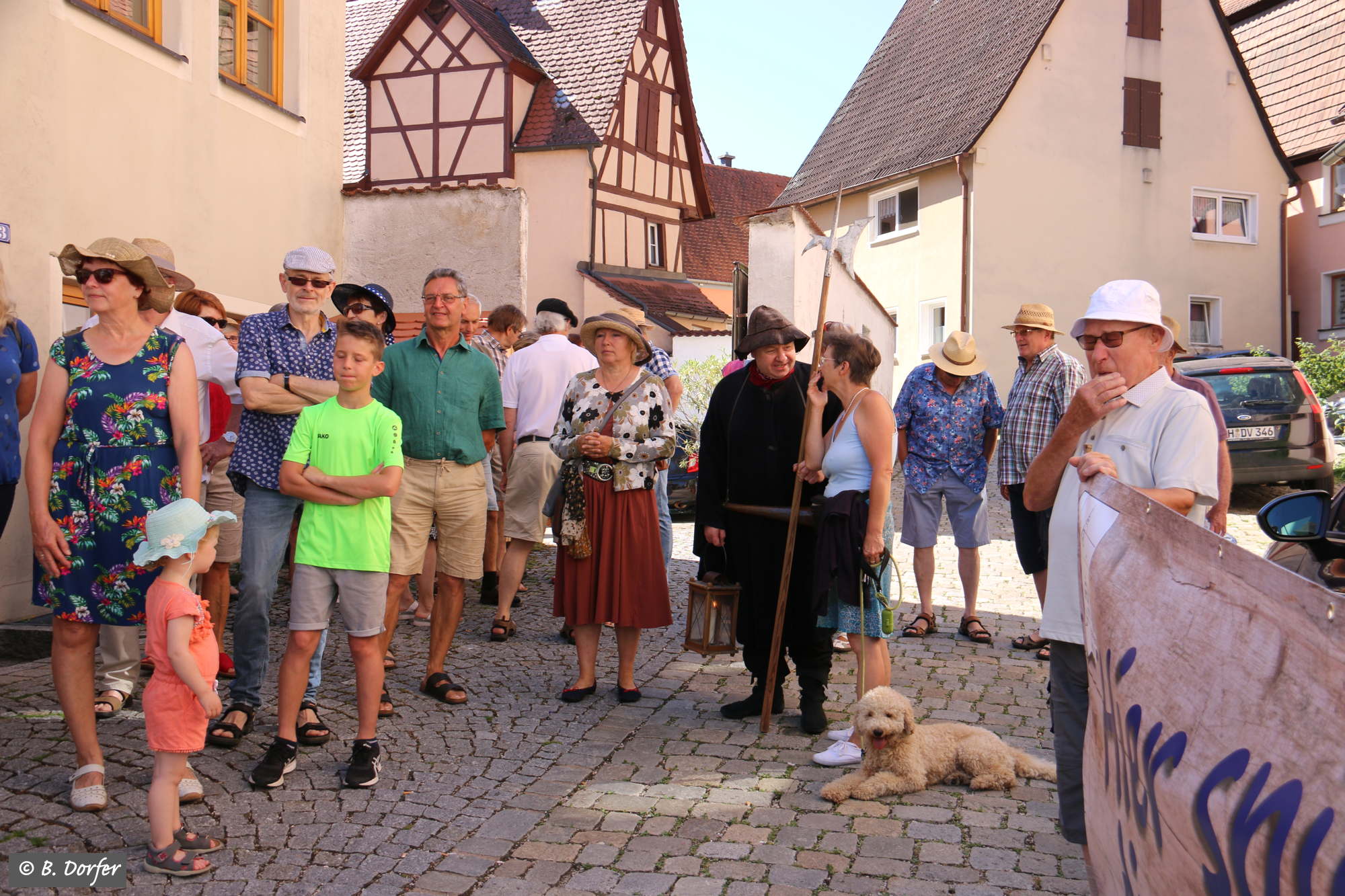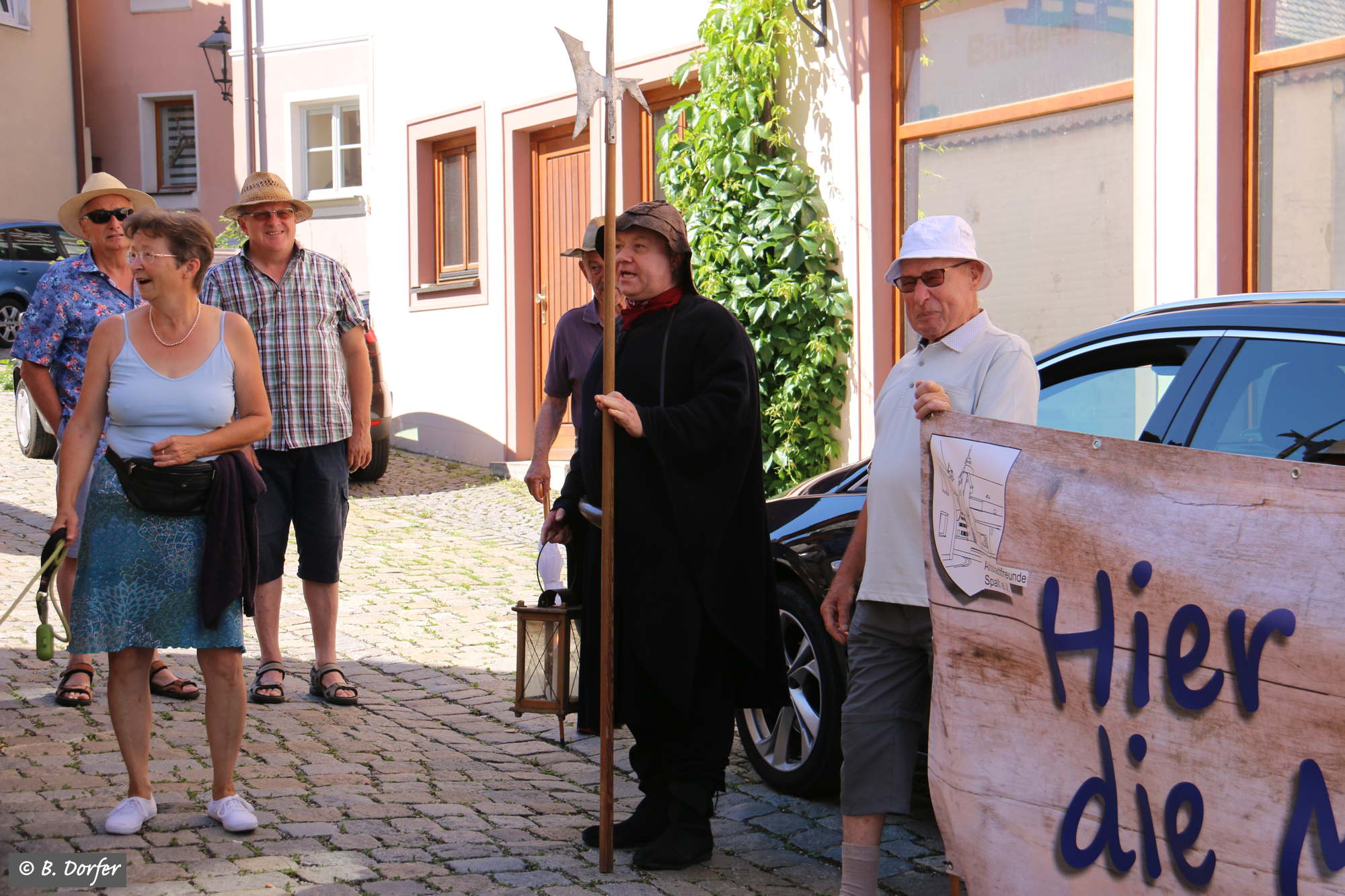 Am Marktplatz in Spalt ging es los. Über 50 Interessierte hatten sich eingefunden. Angeführt von den wieder beeindruckend aufspielenden fränkischen Straßenmusikanten führte der Spaziergang quer durch die Altstadt. Durch die engen Gassen, vorbei an wunderbar renovierten Häusern hin zu einigen der schönsten Plätze der Stadt. Dort ließ es sich der mitwandernde Spalter Nachtwächter, Josef Salbaum, trotz der ungewöhnlichen Tageszeit nicht nehmen einige unterhaltsame, nachdenkliche und skurrile Geschichten aus längst vergangenen Spalter Zeiten zum Besten zu geben.