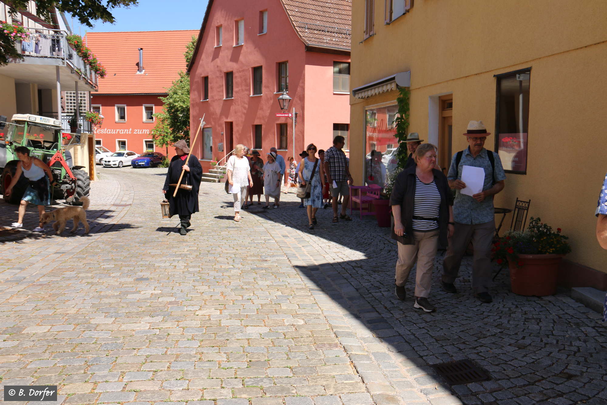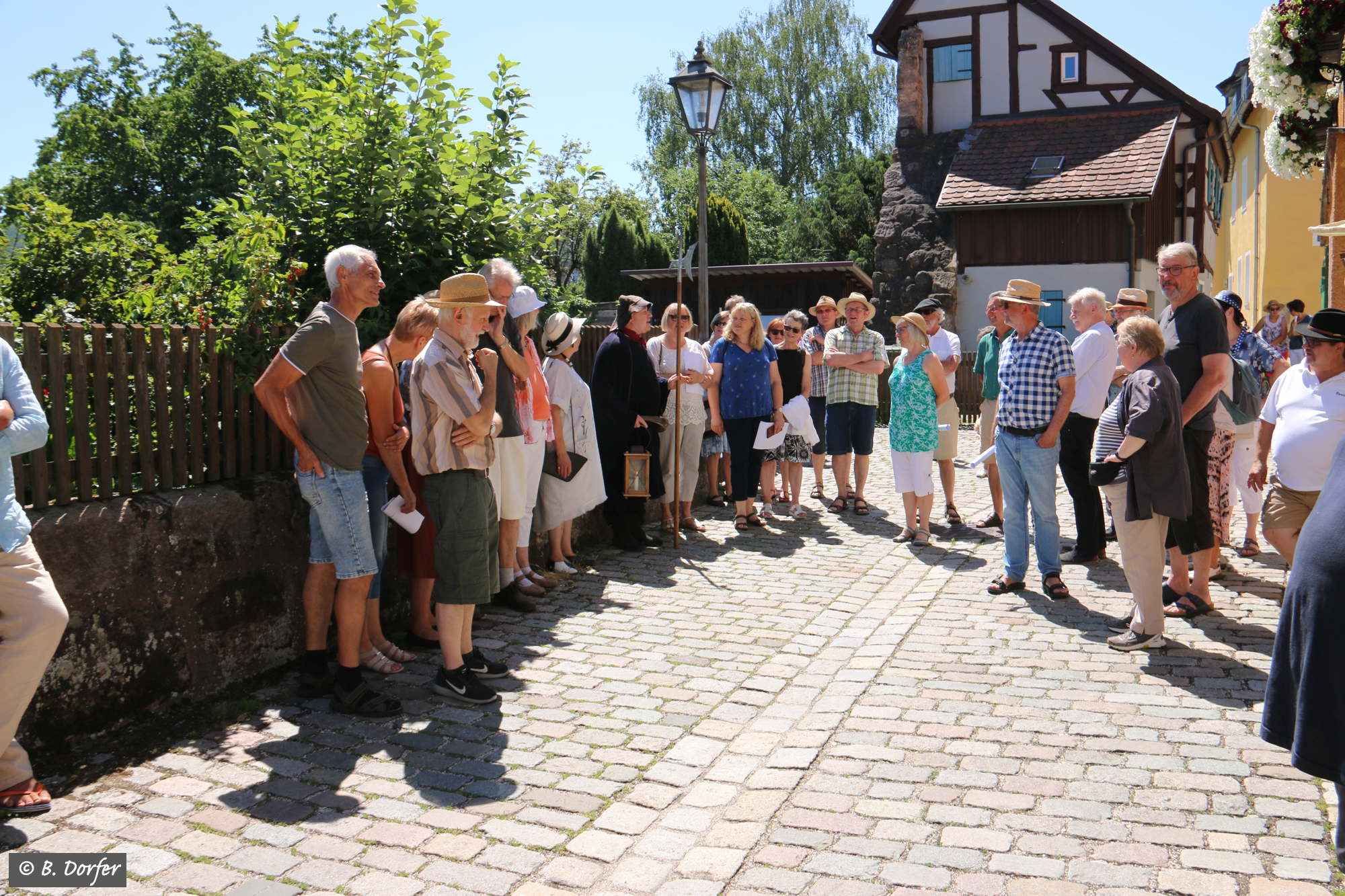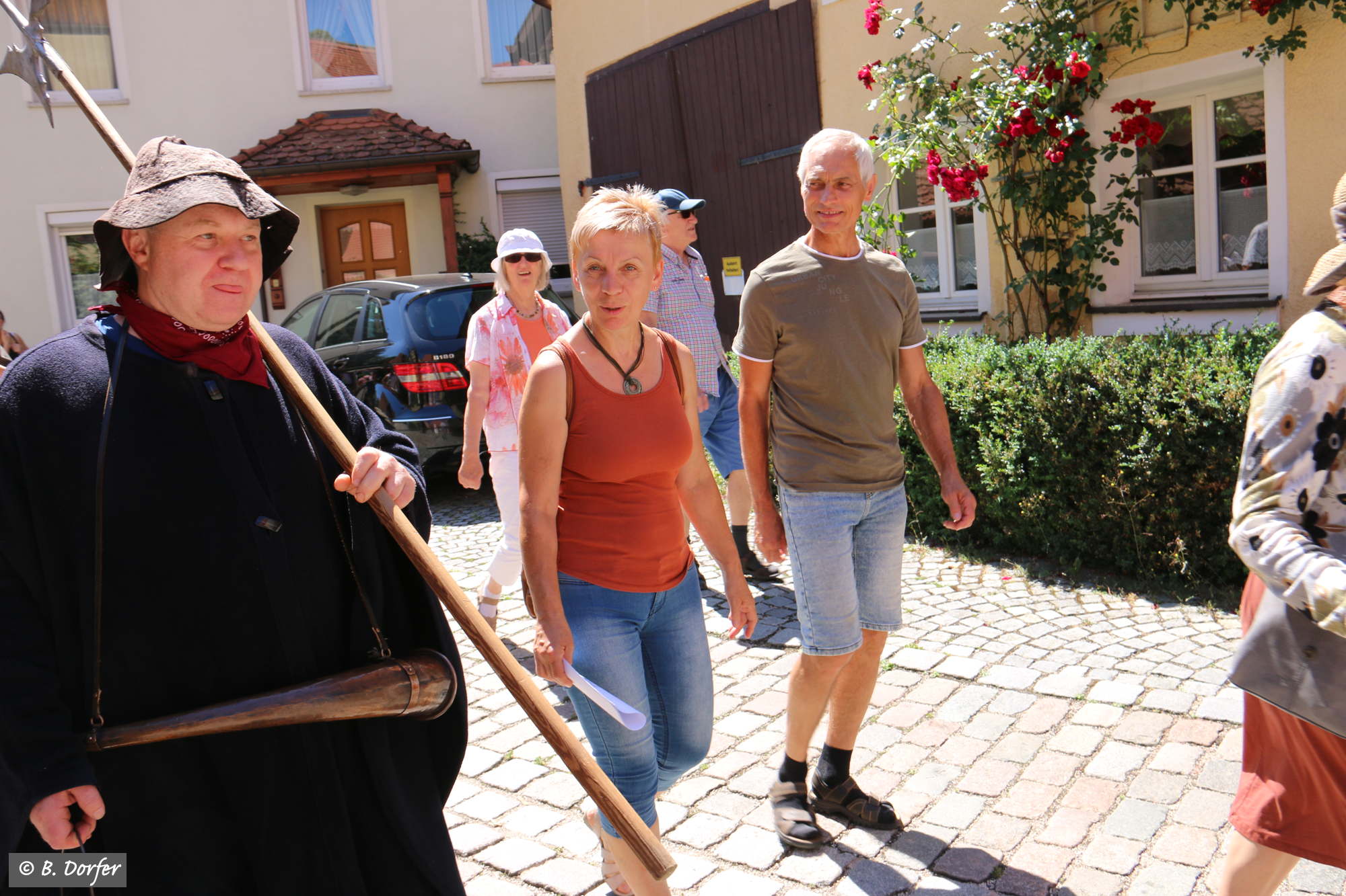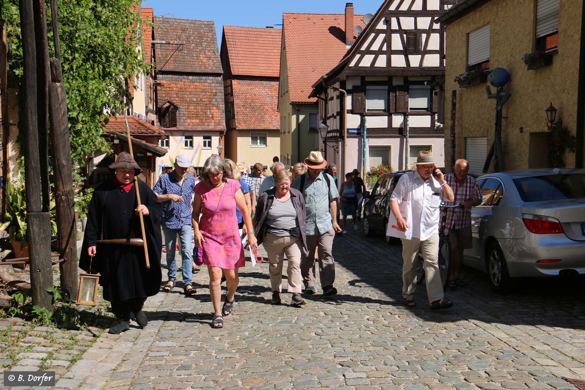 Am Marktplatz in Spalt ging es los. Über 50 Interessierte hatten sich eingefunden. Angeführt von den wieder beeindruckend aufspielenden fränkischen Straßenmusikanten führte der Spaziergang quer durch die Altstadt. Durch die engen Gassen, vorbei an wunderbar renovierten Häusern hin zu einigen der schönsten Plätze der Stadt. Dort ließ es sich der mitwandernde Spalter Nachtwächter, Josef Salbaum, trotz der ungewöhnlichen Tageszeit nicht nehmen einige unterhaltsame, nachdenkliche und skurrile Geschichten aus längst vergangenen Spalter Zeiten zum Besten zu geben.